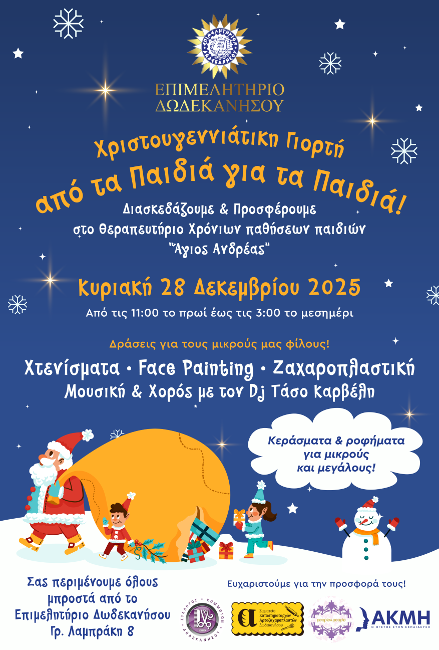 Το Επιμελητήριο Δωδεκανήσου διοργανώνει την Κυριακή 28 Δεκεμβρίου 2025 τη Χριστουγεννιάτικη Γιορτή «από τα Παιδιά για τα Παιδιά», μια ανοιχτή εκδήλωση αφιερωμένη στη στήριξη του Θεραπευτηρίου Χρόνιων Παθήσεων Παιδιών «Άγιος Ανδρέας». Από τις 11:00 έως τις 15:00, ο εξωτερικός χώρος του Επιμελητηρίου, στην οδό Γρηγορίου Λαμπράκη 8, μετατρέπεται σε χώρο δημιουργίας για παιδιά και οικογένειες, με δράσεις που έχουν σχεδιαστεί ώστε να συνδυάζουν το παιχνίδι με την προσφορά. Στο επίκεντρο της εκδήλωσης βρίσκονται τα ίδια τα παιδιά, τα οποία συμμετέχουν σε μια μεγάλη γιορτή που αναδεικνύει τη χαρά των Χριστουγέννων μέσα από τη μουσική, τη δημιουργική απασχόληση και τη συνεργασία τοπικών φορέων. Η συγκεκριμένη πρωτοβουλία εντάσσεται στο πλαίσιο των κοινωνικών δράσεων του Επιμελητηρίου Δωδεκανήσου και υλοποιείται με τη συνεργασία επαγγελματικών και εκπαιδευτικών φορέων της περιοχής και επιχειρήσεων, αναδεικνύοντας τη σημασία της συλλογικής συμμετοχής και της κοινωνικής ευθύνης. Η εκδήλωση είναι ανοιχτή στο κοινό και η είσοδος ελεύθερη.